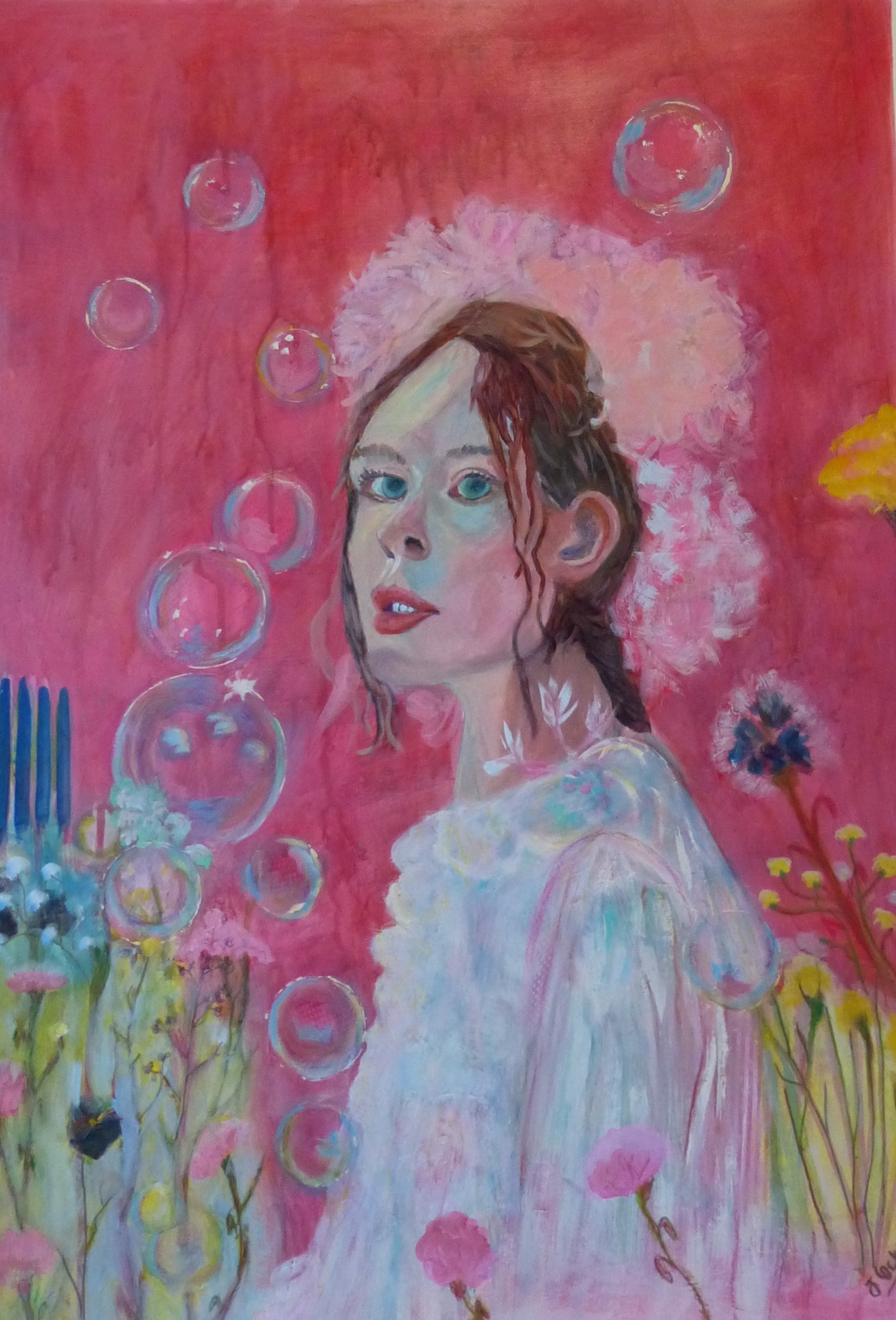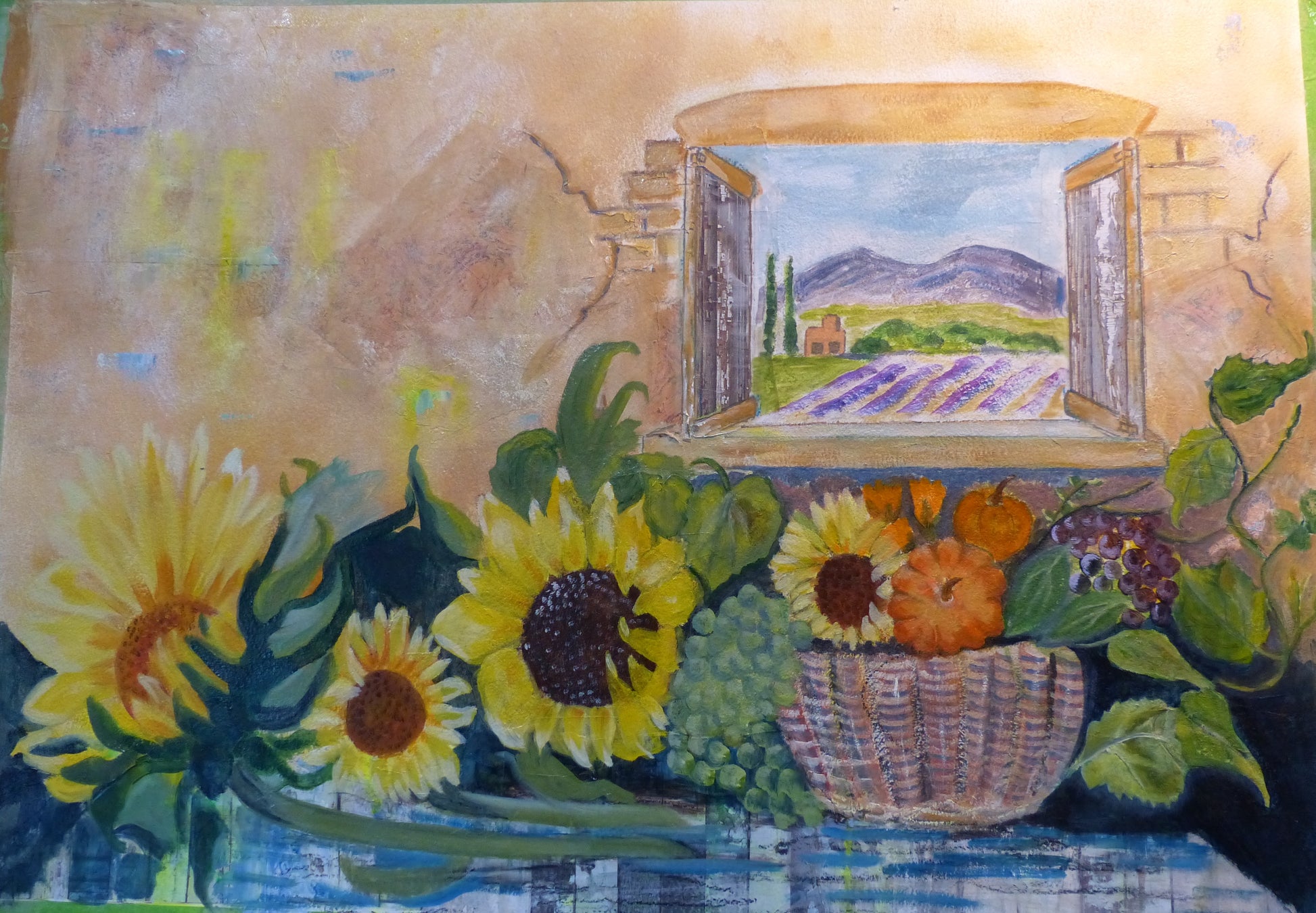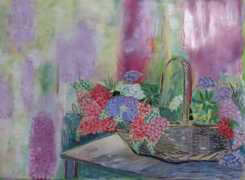 Gathering Lupins is a mixed media painting on 100% cotton cold press water color paper. 300gsm decal-ed edge. It measures 20"x26". This artwork was inspired by many visits to my home garden gathering flowers for display in a basket. Unframed. Other examples available.