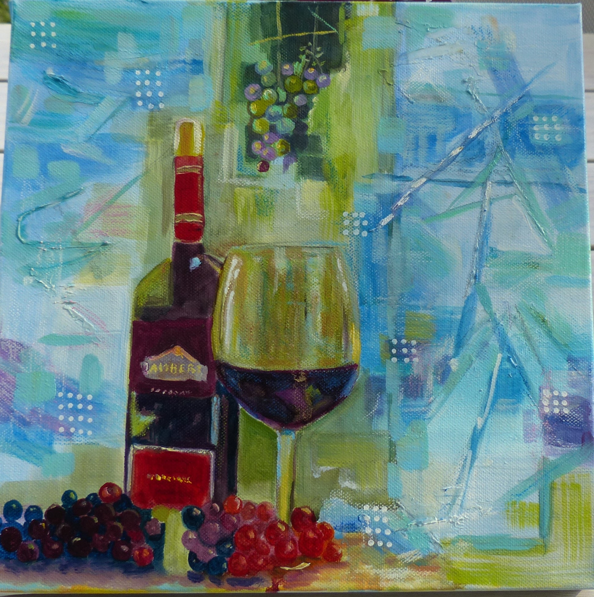 "Celebration", after the harvest is inspired by the knowledge that we only obtain the beautiful fruit following the harvest after all the hard work has been done. A mixed media painting on canvas 12"x12" on cotton gallery wrapped canvas.
