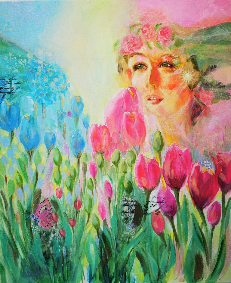 Tranquility Released; is inspired by the tranquil peaceful feeling of a walk through a beautiful garden. In this case tulips. There is something magical and healing, peaceful and calming about being immersed in flowers. This is an original mixed media painting on cotton Gallery wrapped canvas 20"x24"