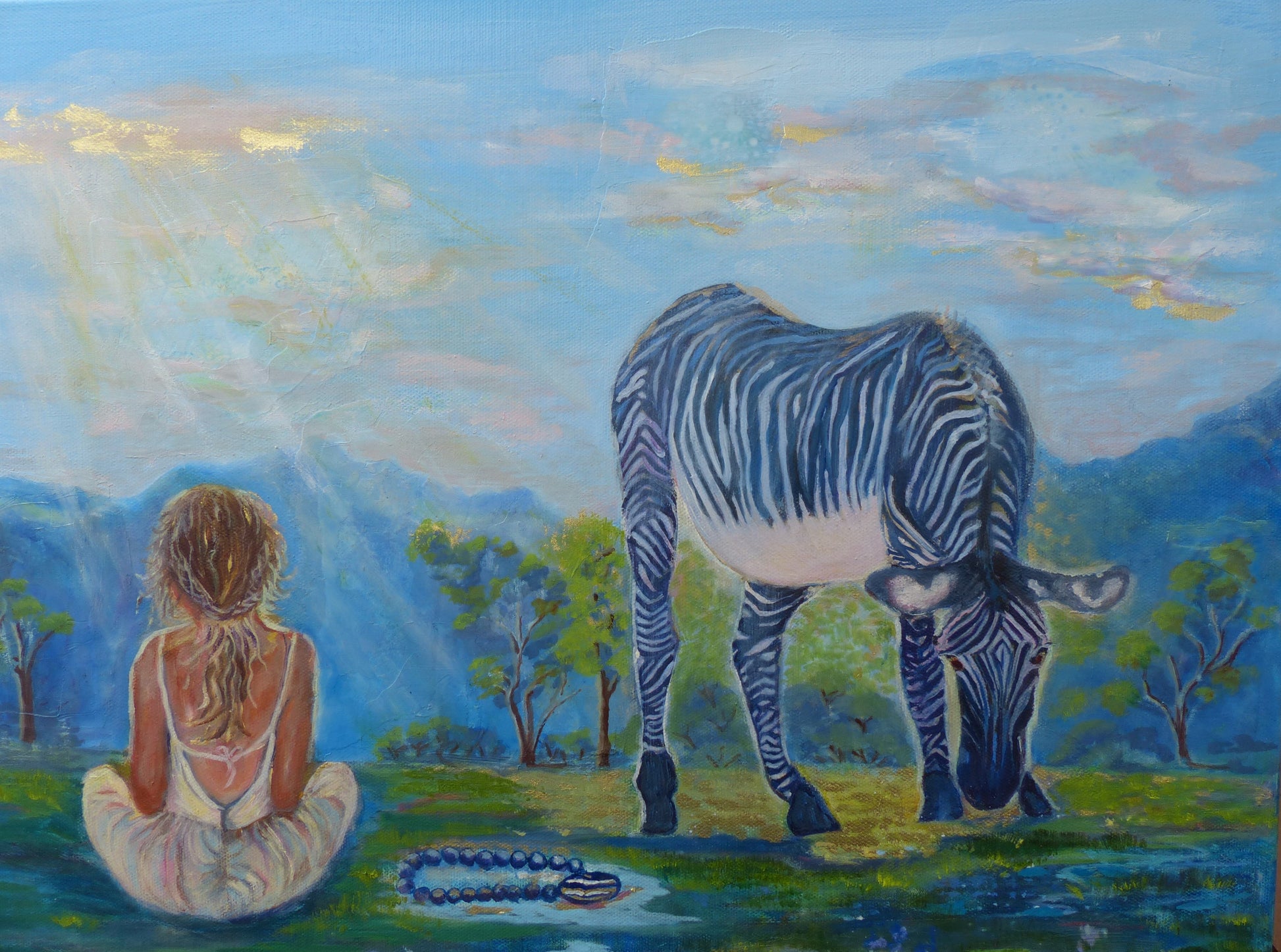 Zebra Pearls was inspired by a dream I had, in the dream the Zebra was sending me a message, the message was that everything I desired was already at my feet. In the painting the young girl seems to be unaware of the riches which lay right beside her, Her focus is elsewhere she seems in a dream like state. The Zebra is pointing the way, to balance, freedom and protection. Zebra pearls or Zebra stones are meant to encourages us to find our balance in life to always see others in a positive light and look deeper than just as a superficial level. This painting is mixed media and measures 20"x16" and is painted on cotton Gallery wrapped canvas, the edges are painted. Comes ready to hang.