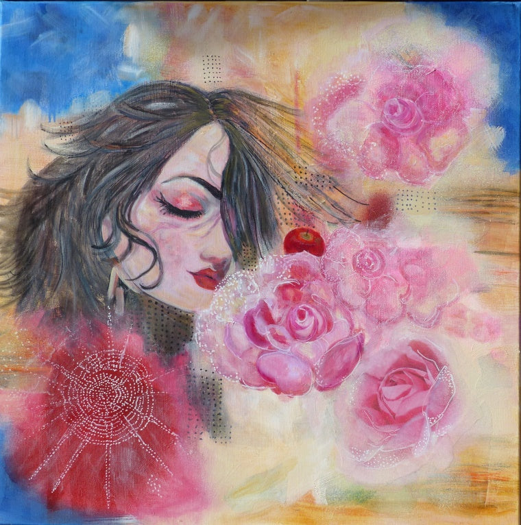 "The Rose of Sharon," This painting is a depiction of the story in Solomon. He wrote; "Her love is like an apple. A tree among many trees of the forest. She is a celebration of all that is good. She is genuine in her love. She nurtures those she loves and cares about. This is a celebration of women who exemplify these qualities. The cobweb is a reminder not to place her trust and hope in fragile things. Painted on cotton gallery wrapped canvas 24"x24" mixed media. Comes ready to hang.