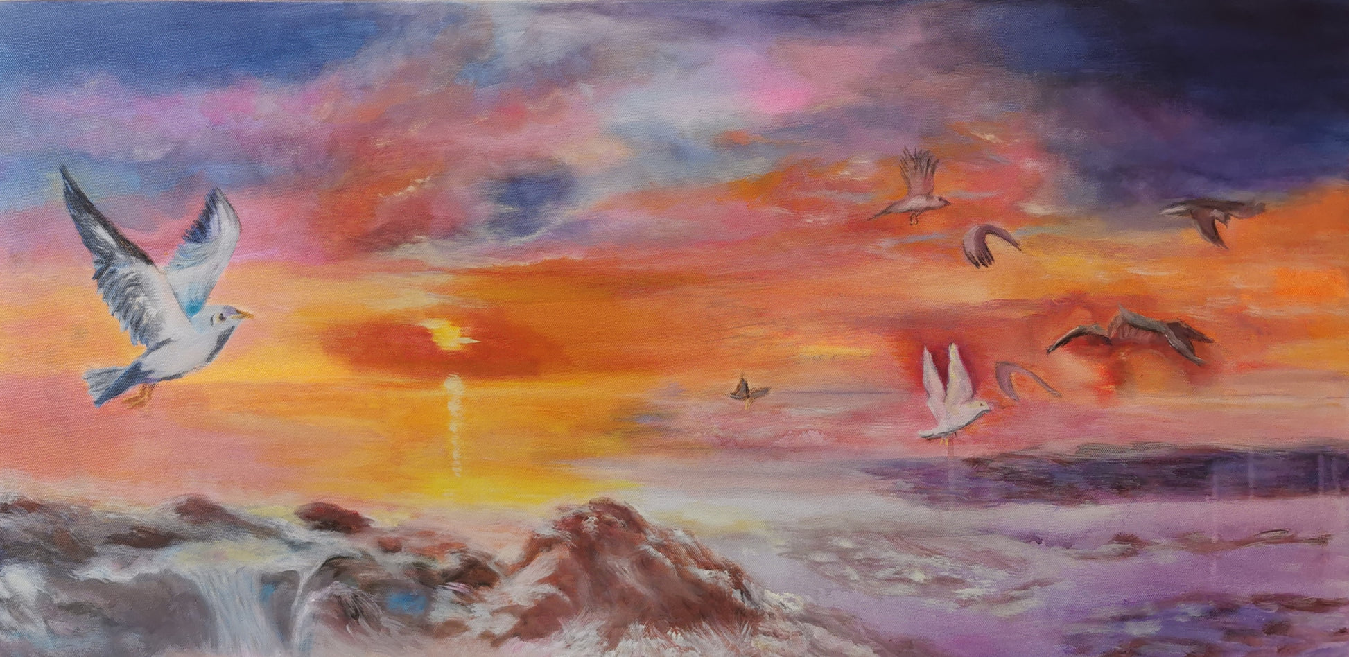 Canvas Print created from a mixed media painting, crafted on cotton Gallery Wrapped Canvas, size 18"x36". A New Dawn is a celebration of the start of a new chapter in my life as a professional artist.