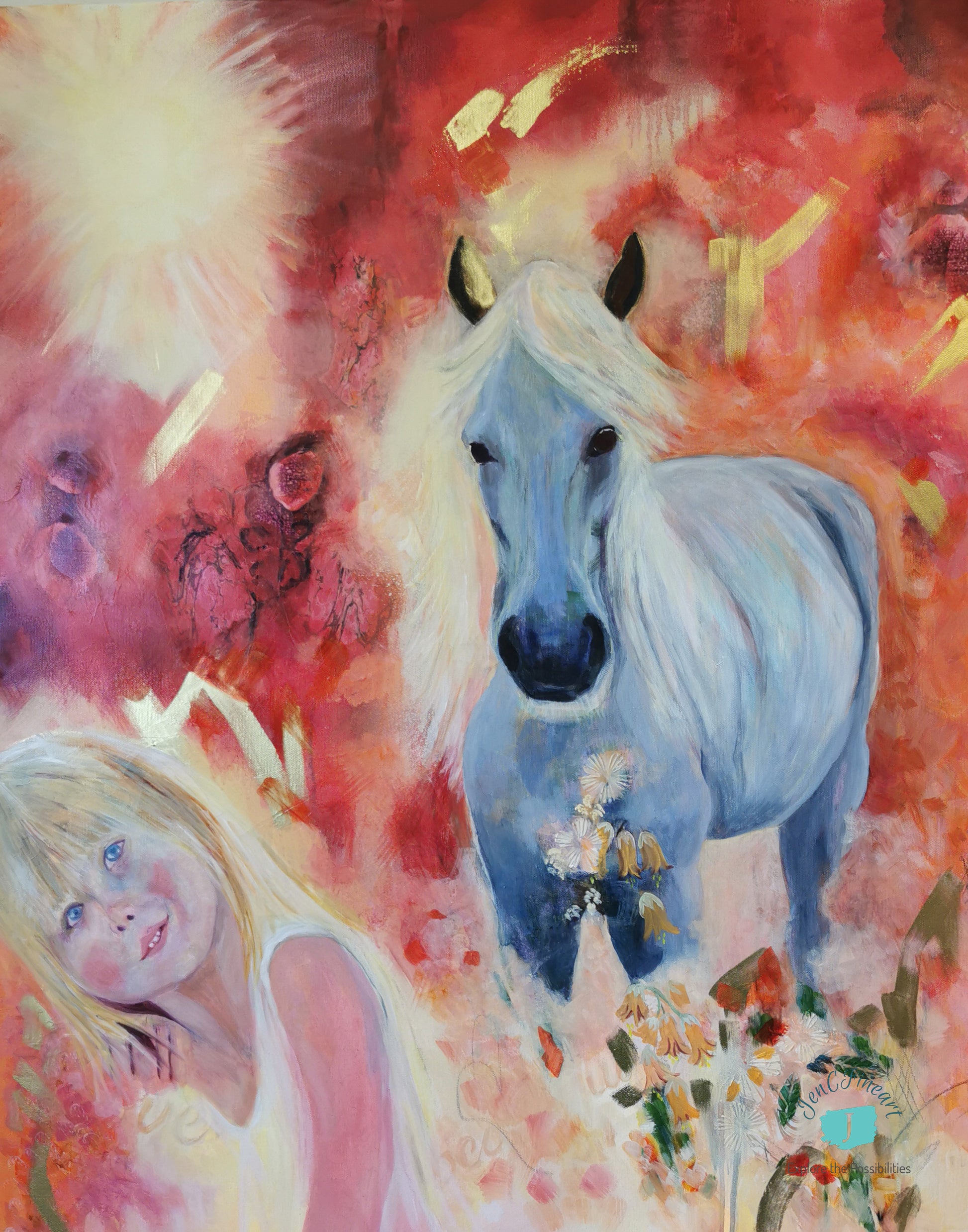 "Heavens Dew". It is every little girls dream to own a horse, ride a horse there is something special even heavenly as you watch the interaction between horse and rider. The horse is intuitive and senses the emotion and trust of their rider and it responds accordingly. Our little grand-daughter Isla's first experience riding a horse was the inspiration for this painting.
