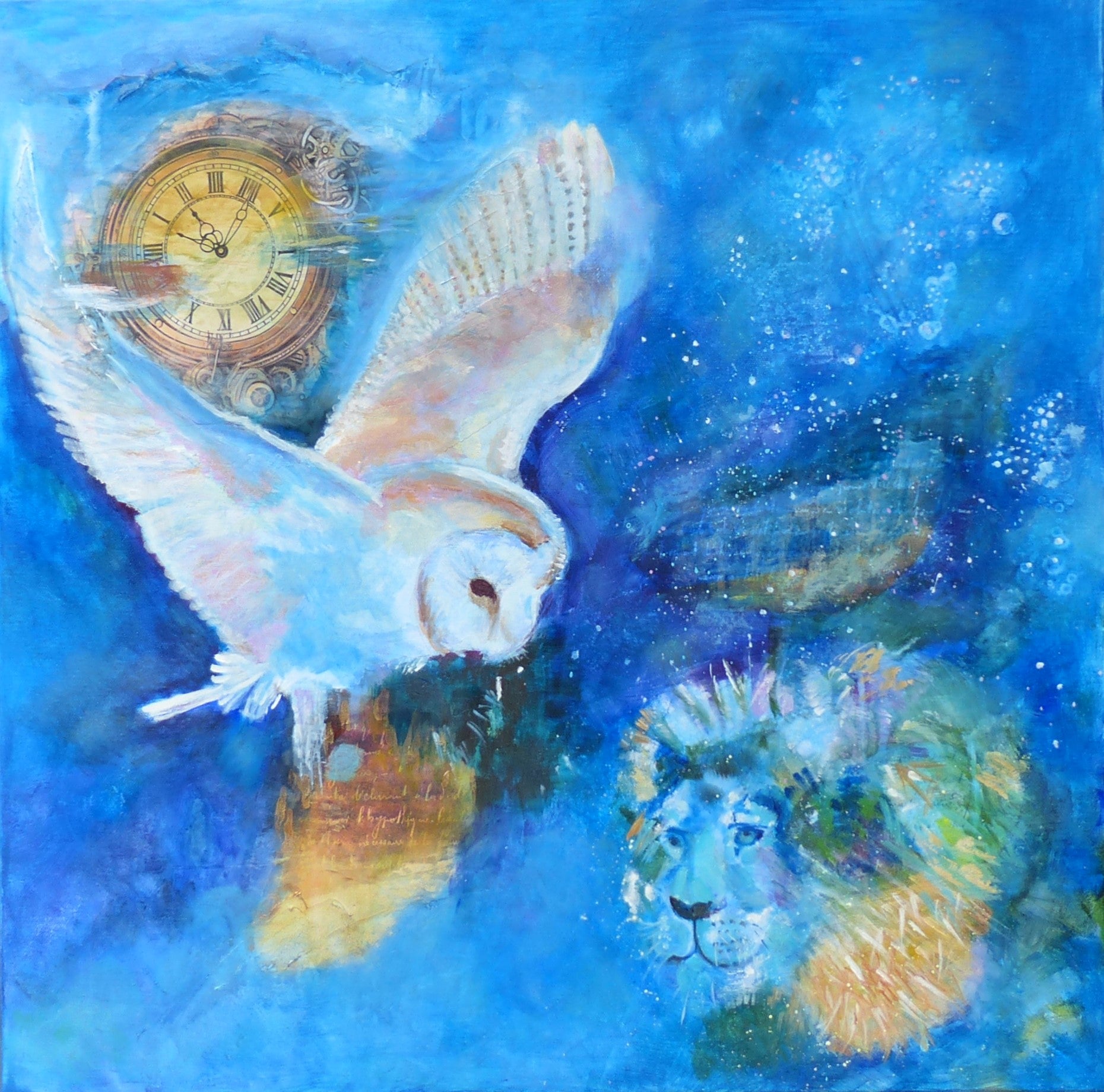 "The lion and the owl", Is an original mixed media painting. Painted on cotton gallery wrapped canvas 24"x24."The white owl in this piece is symbolic of wisdom and inner purity and of inner change and transformation occurring. The lion signifies strength and courage. There is a lioness bursting to get out of each of us to prove that we are equal to the task. We can accommodate change and transformation if we try.