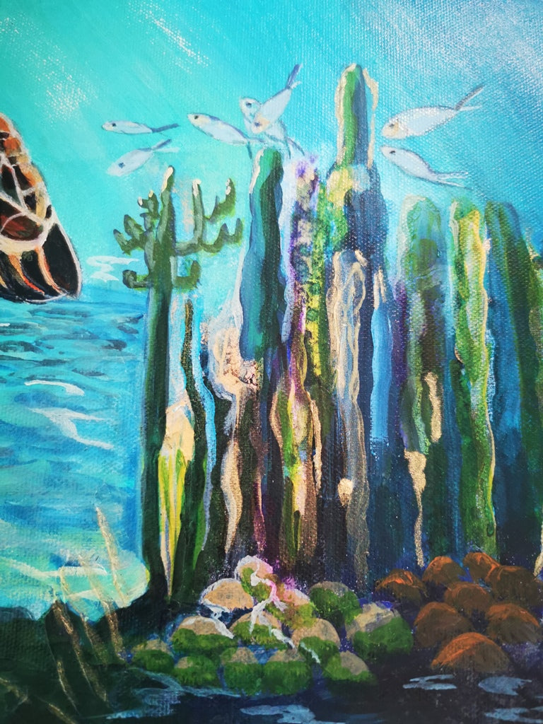 This painting "Swimming Free," is an underwater painting of a turtle and is inspired by a number of documentaries I have watched on the affects of human beings on the marine life in our oceans. The pollution now In our oceans is having a detrimental affect on the health and well being of our marine life. Turtles are often entangled in nets and ropes floating in the ocean, plastics floating in our ocean are slow to break down and once swallowed the particles cannot be removed. It is our responsibility to take care of our marine life by being more proactive and making sure we take our rubbish home to dispose of correctly. This will ensure these beautiful creatures can be enjoyed by future generations. This painting is 18"x18" and comes ready to hang.
